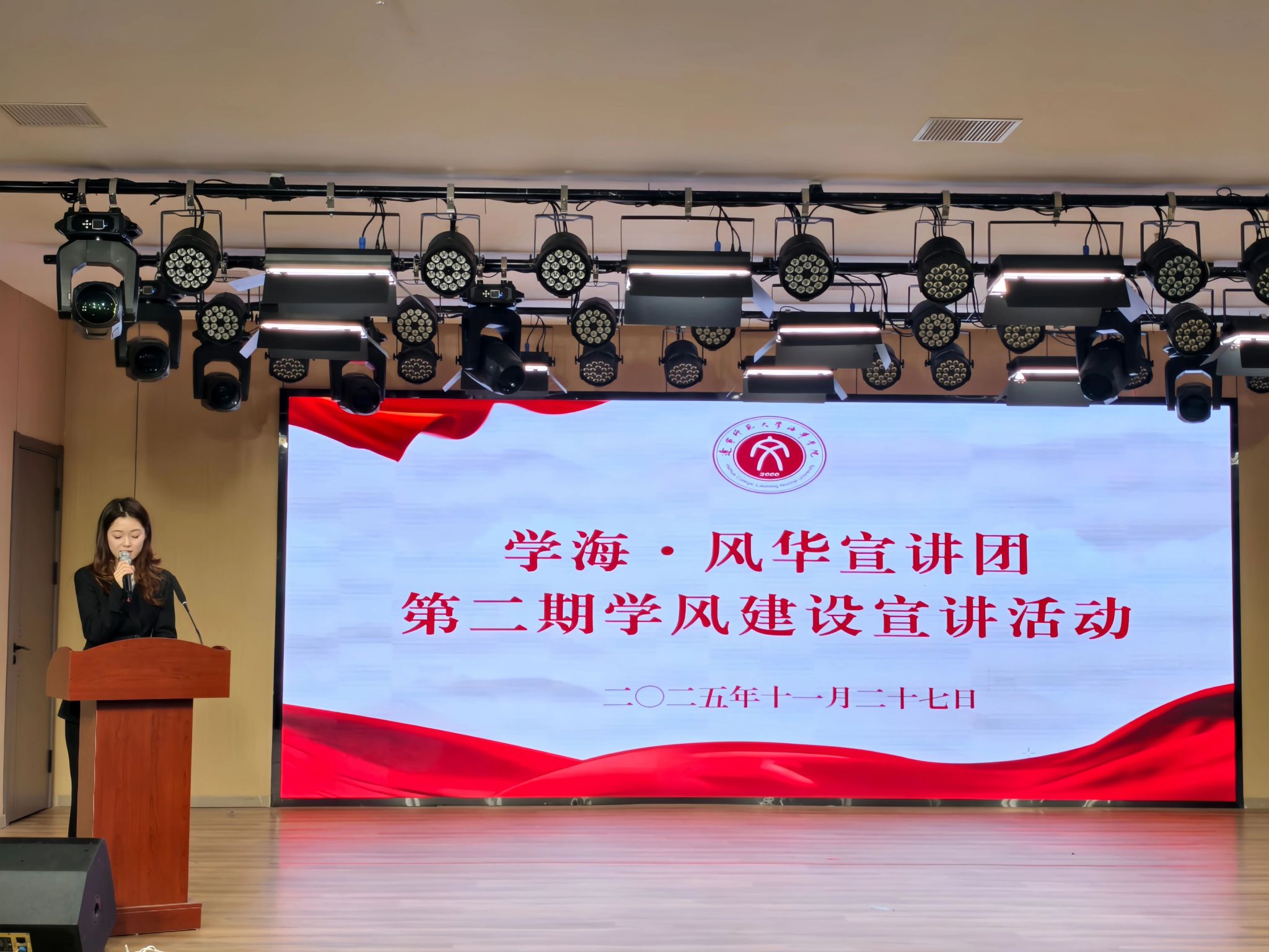 为搭建优质学习交流平台,凝聚奋进力量,11月27日晚,我校“学海•风华”第二期学风建设宣讲活动在东校区图书馆报告厅举行。相较于首期聚焦成长经历的分享,本期活动以“学习进取”为核心主题,邀请两位优秀学子登台分享治学心得与实践经验,为现场学子带来兼具思想厚度与实用价值的学习指引。