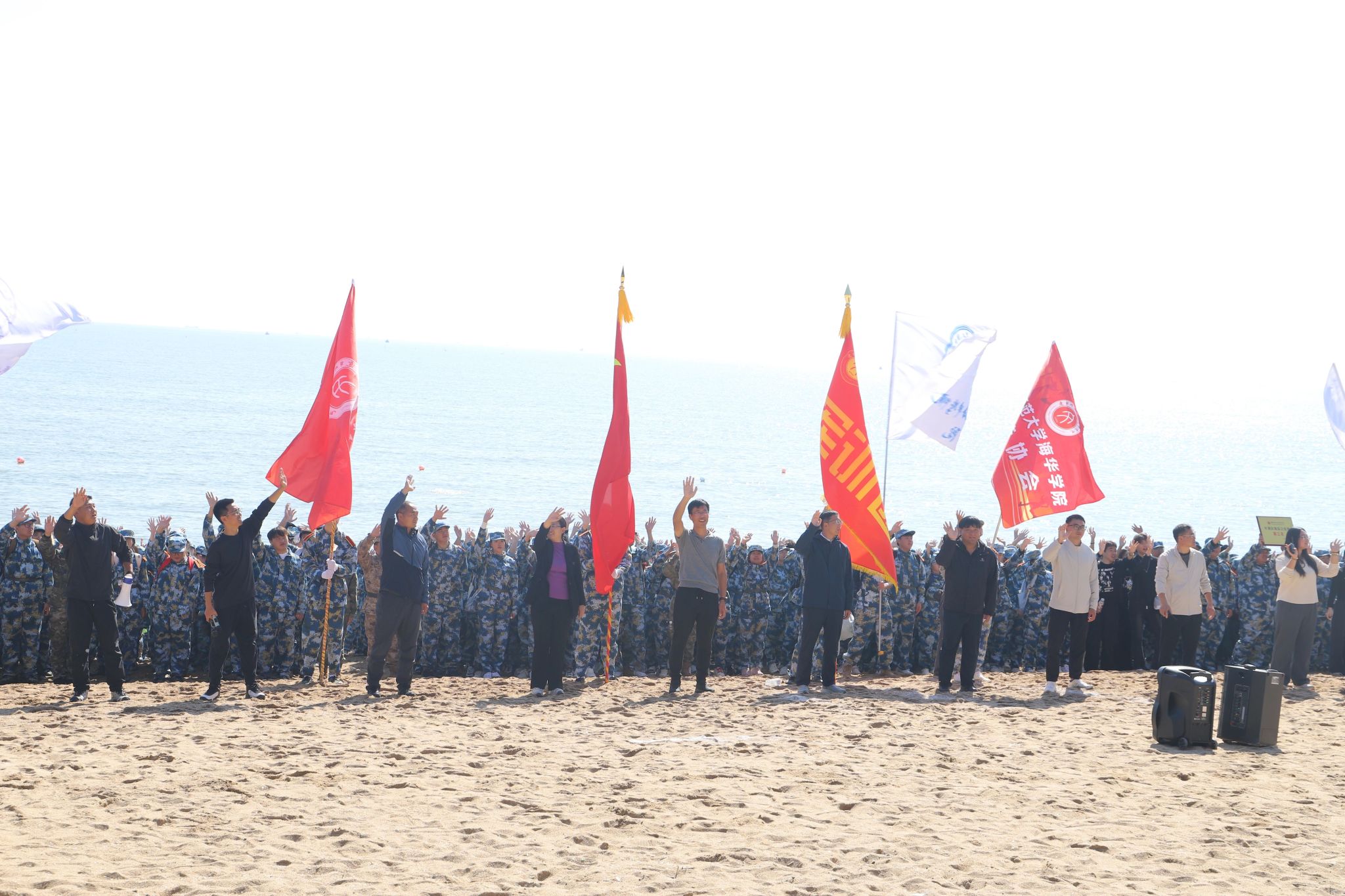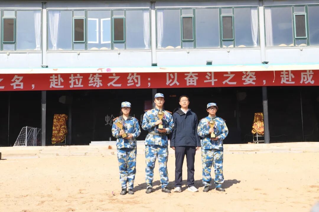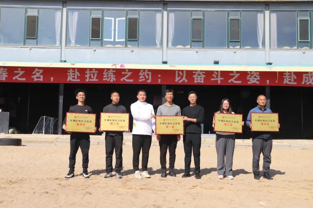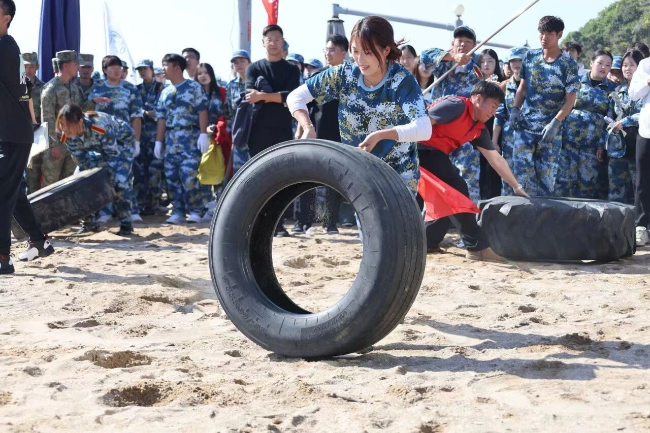 翻轮胎区,半人高的重胎前,队员们分工默契:有人把控节奏全程引领,有人扑在胎侧全力助力,轮胎在沙滩上碾出深痕,汗水浸湿了迷彩服,却没人肯放慢速度。最终外国语学院与体育学院联队获得冠军,信息科学与技术学院、艺术与传媒学院分别获得亚军、季军。