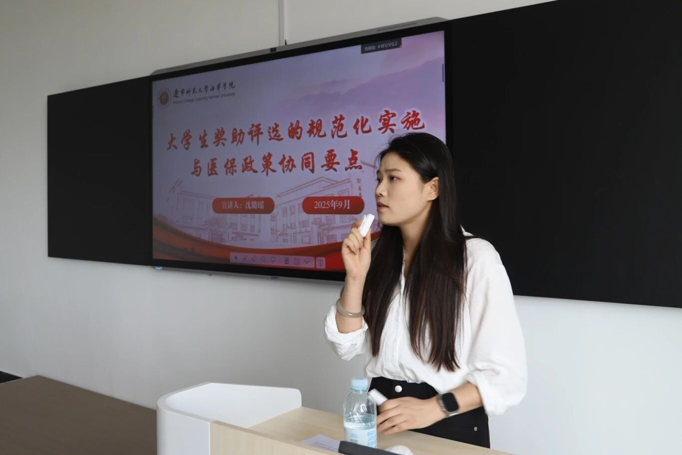此次培训,沈璐瑶老师从家庭经济困难学生认定、奖助政策体系、退役士兵资助政策以及医保政策协同要点等方面入手,系统阐述了相关工作要求与操作规范。她强调家庭经济困难认定要坚持“实事求是、公开公平、民主评议”原则,严格执行告知、申请、认定、公示、备案的工作流程;全面介绍了学校“奖、助、贷、补、免、勤”六位一体的资助格局,并详细解读了各类奖学金、助学金的申请条件、评审标准与发放程序;明确了退役士兵学生学费减免、国家助学金及应征入伍服兵役学费补偿的标准与办理路径;同时系统梳理了医保集中参保、缴费标准及基本待遇等政策要点。